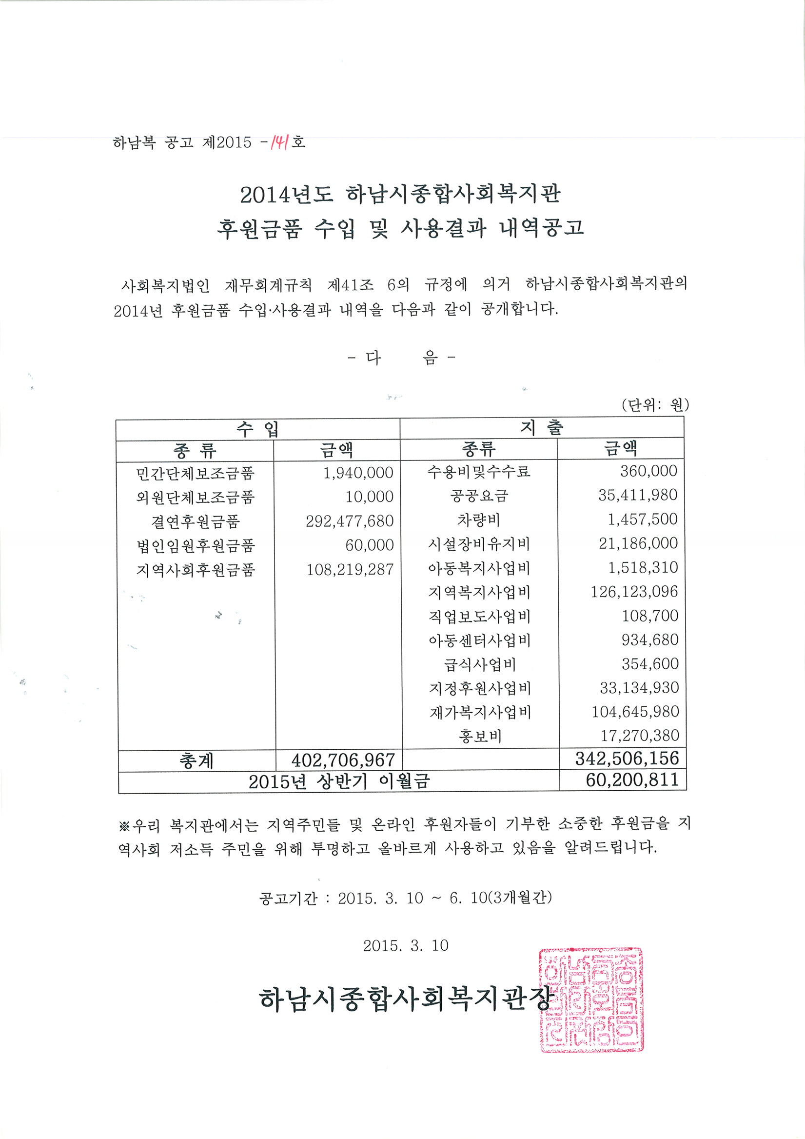 1. 제목 : 2014년도 하남시종합사회복지관 후원금품 수입 및 사용결과 내역 공고