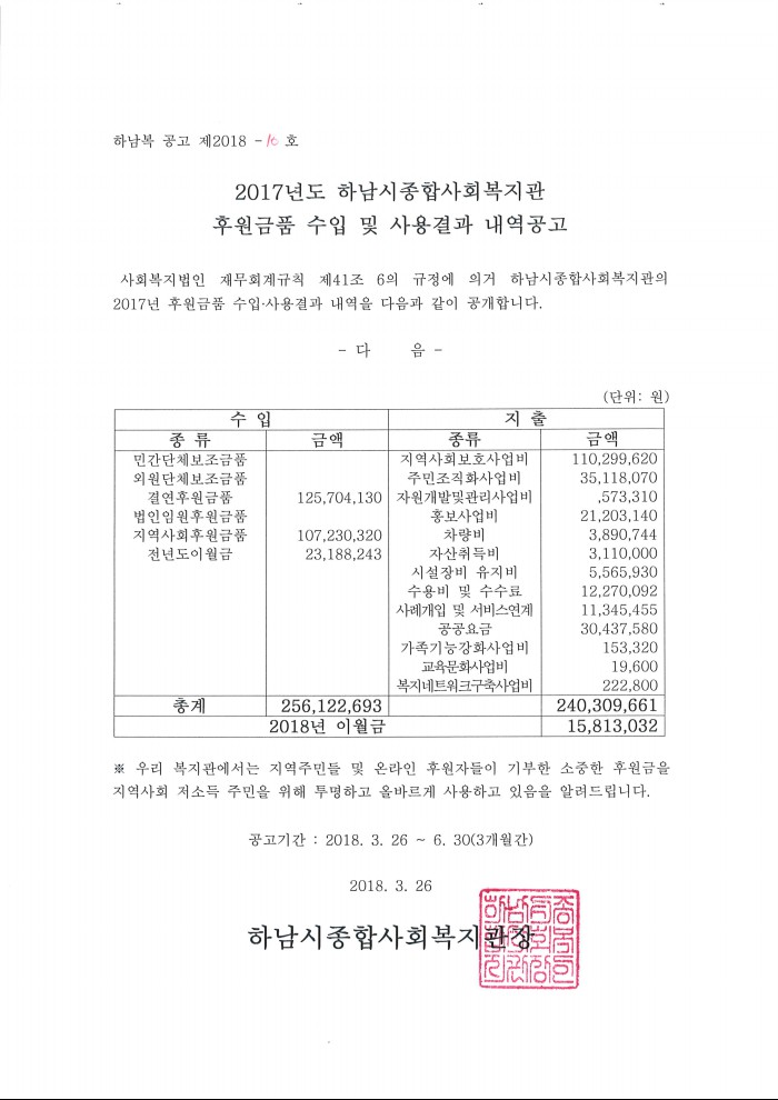2017년도 후원금품 수입․사용결과 보고서를 다음과 같이 공고합니다.