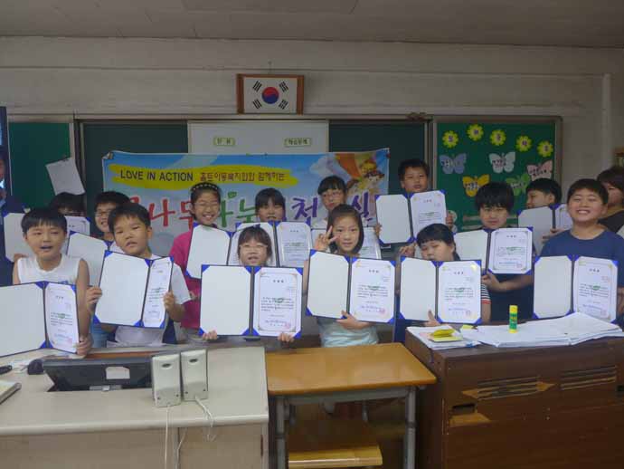 2013년 5월 27일부터 시작한 ‘꿈나무 나눔실천교실’이 어느 덧 9회기가 되었습니다. 9회기는 ‘제 1기 꿈나무 나눔실천교실 수료식’으로 진행되었습니다. 우리 꿈나무 나눔 무버(Mover) 친구들은 나눔을 실천한 만큼 나무에 한 개 한 개 사과스티커를 채워왔습니다. 나눔 실천을 틈틈이 잘 실천하여 스티커를 채운 4학년 하늘반 친구들에게 ‘제 1기 꿈나무 나눔실천교실 수료증’과 함께 선물을 전달하였습니다. 나눔실천으로 나무를 완성하여 선물을 받아 뿌듯해 하는 우리 서부초 친구들은 앞으로도 풍성한 사과를 채운 나무처럼 따뜻한 나눔으로 마음을 채워가는 꿈나무로 성장할 것입니다.