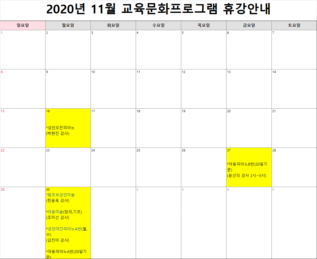 * 교육문화프로그램은 4주차 기준으로, 5주차 휴강일은 아래 달력을 참고해주시기 바랍니다. (법정공휴일은 보강하지 않습니다.)