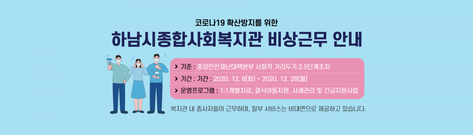 * 하남시종합사회복지관은 코로나 19로 인한 비상상황에서 1:1개별치료, 결식아동 지원, 사례관리 및 긴급지원사업 등은 지속적으로 제공합니다.