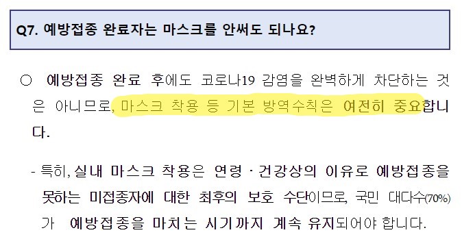 예방접종 완료자의 마스크 착용 의무 해지는 사람이 많지 않은 야외에 한정되는 것이며, '실내'에서는 백신 접종 완료 후에도 실내 마스크 착용은 여전히 의무입니다.
