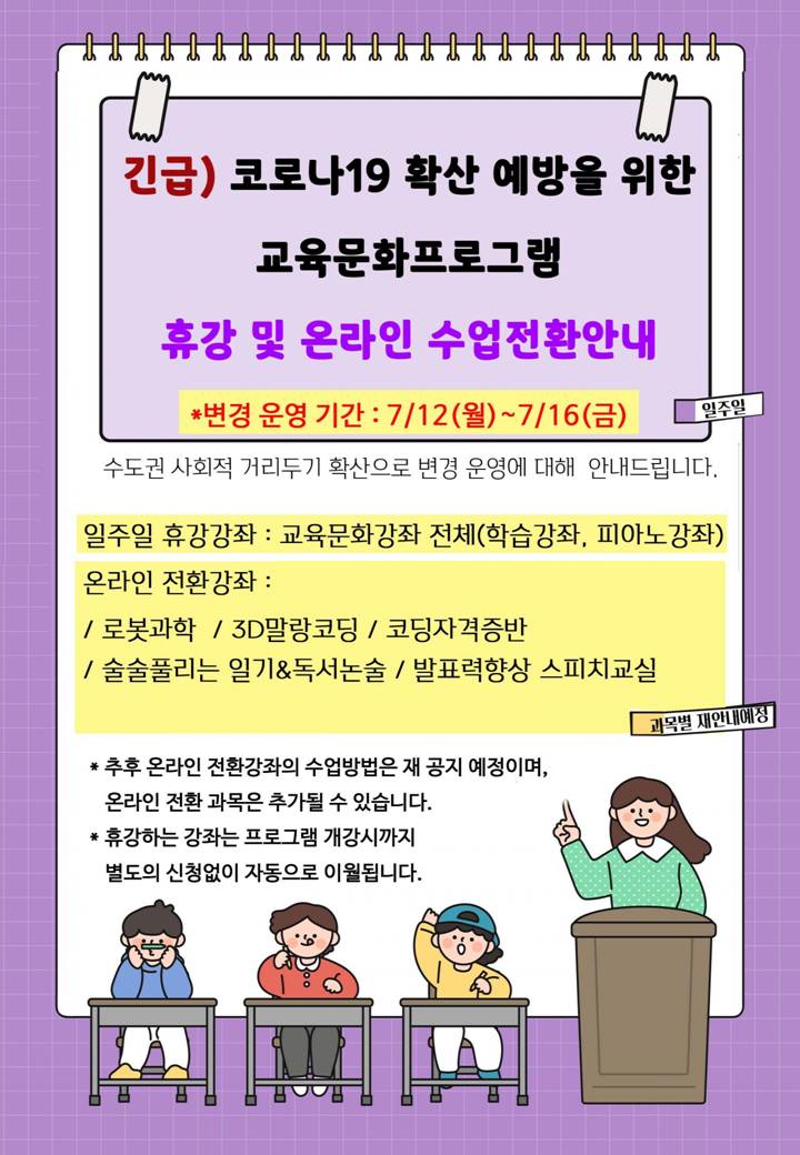 * 일주일 휴강강좌의 이월 및 환불, 보강일정은 수강과목별로 순차적으로 연락예정 *