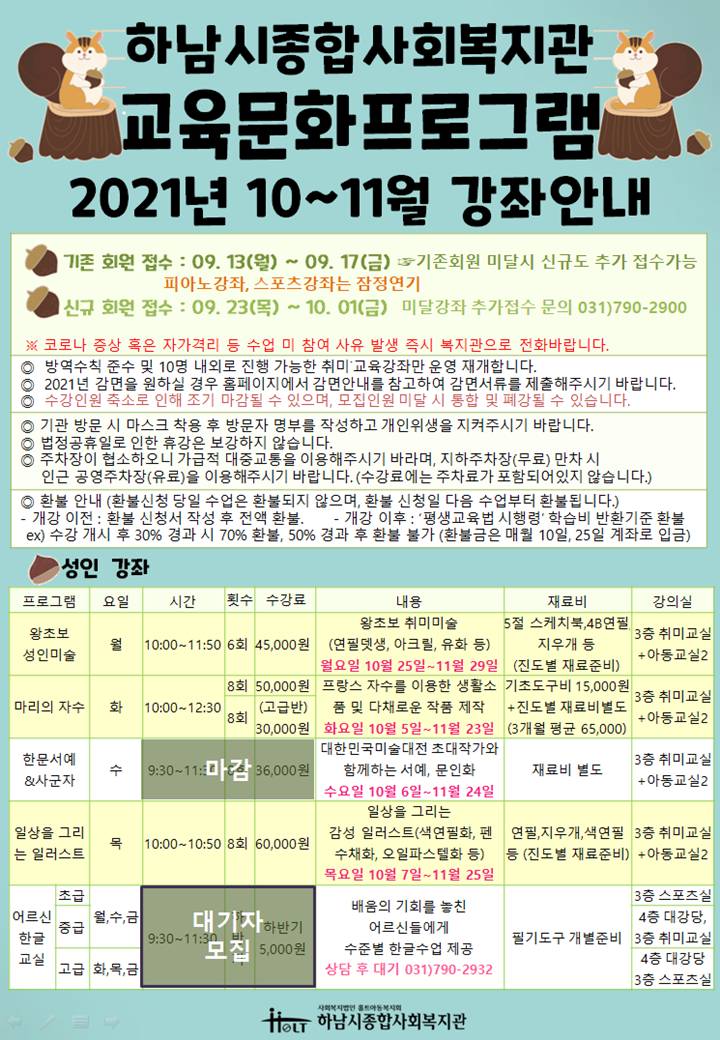9/23일(금)~10/01(금)에는 대기 강좌를 제외한