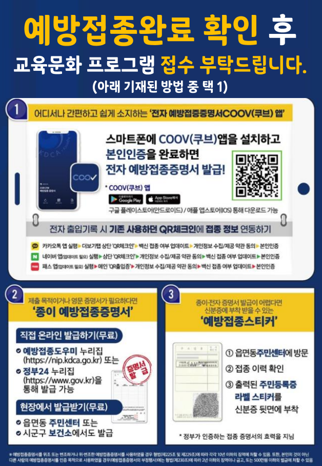 특히 성인강좌는 백신접종증명서(2차) 및 PCR검사 음성(48시간 이내) 확인 후 접수 할 수 있음에 따라,