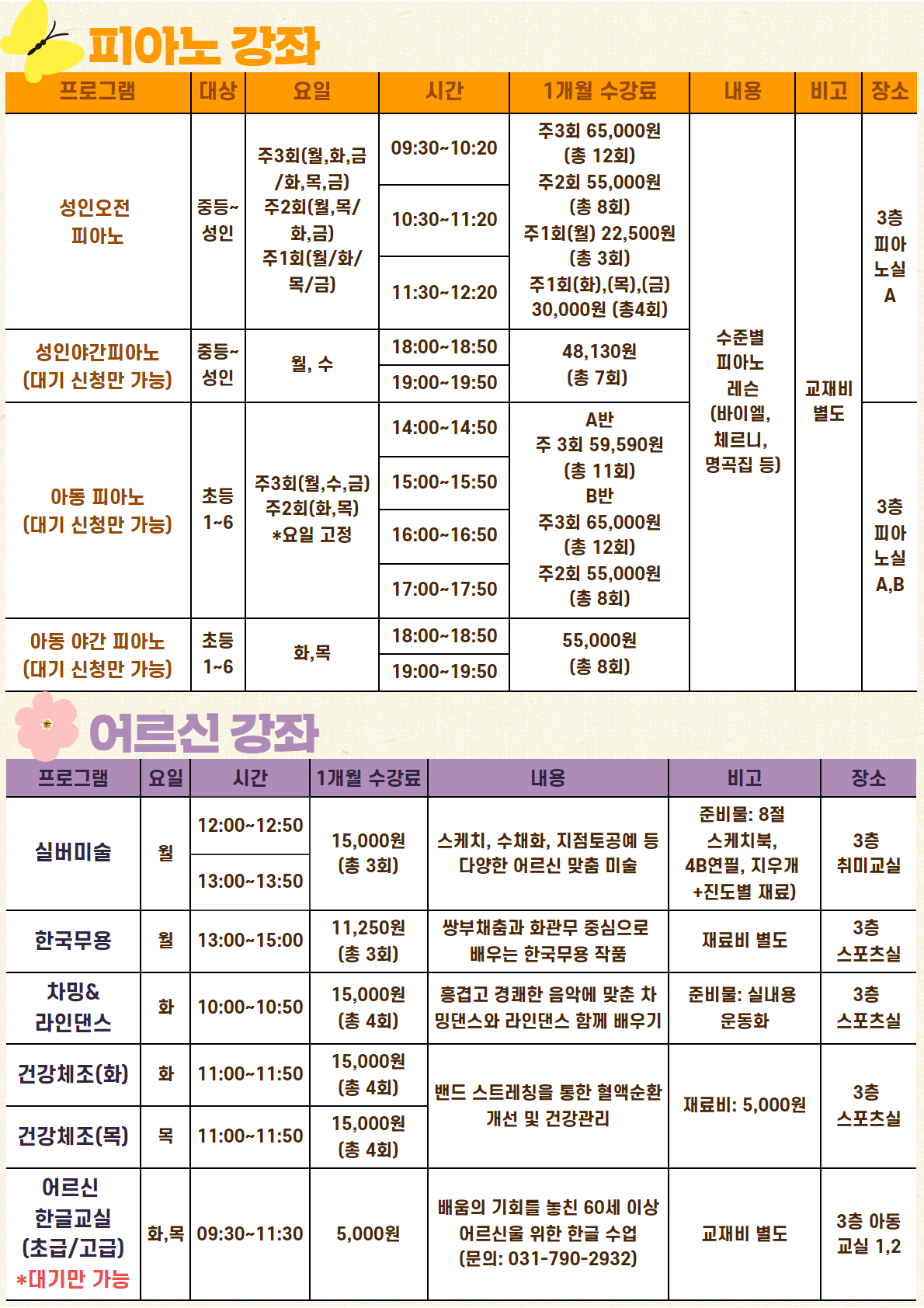 운영 강좌: 한문서예, 클레이쿠키, 아동피아노B, 성인야간피아노