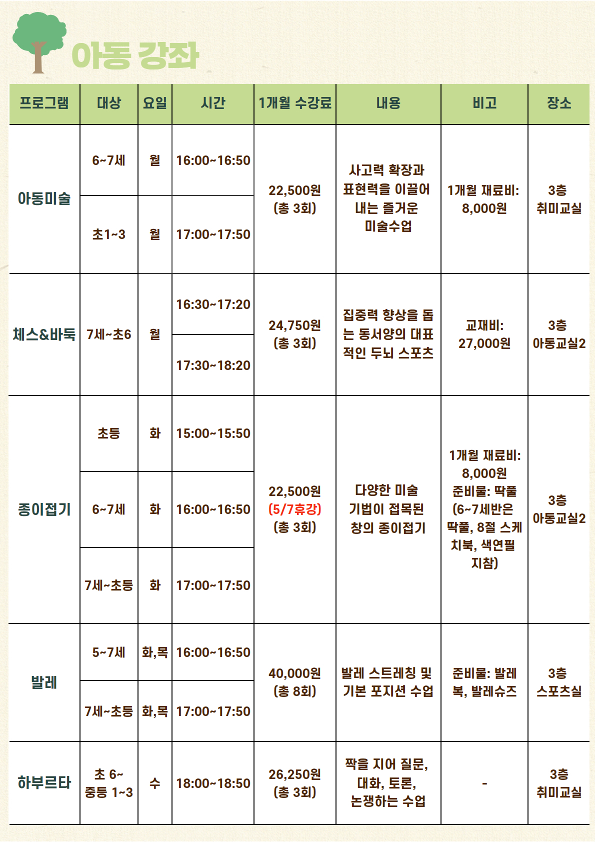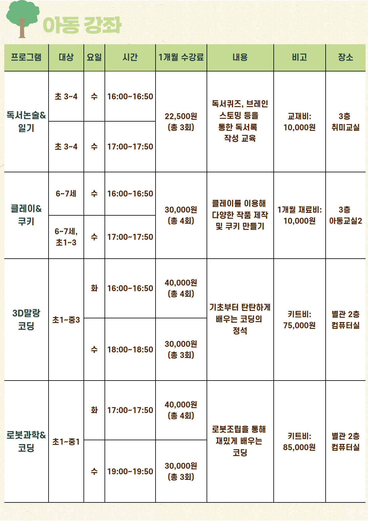 휴강 강좌: 로봇과학&코딩, 3D말랑코딩, 아동피아노A, 요가&필라테스, 독서논술, 하부르타