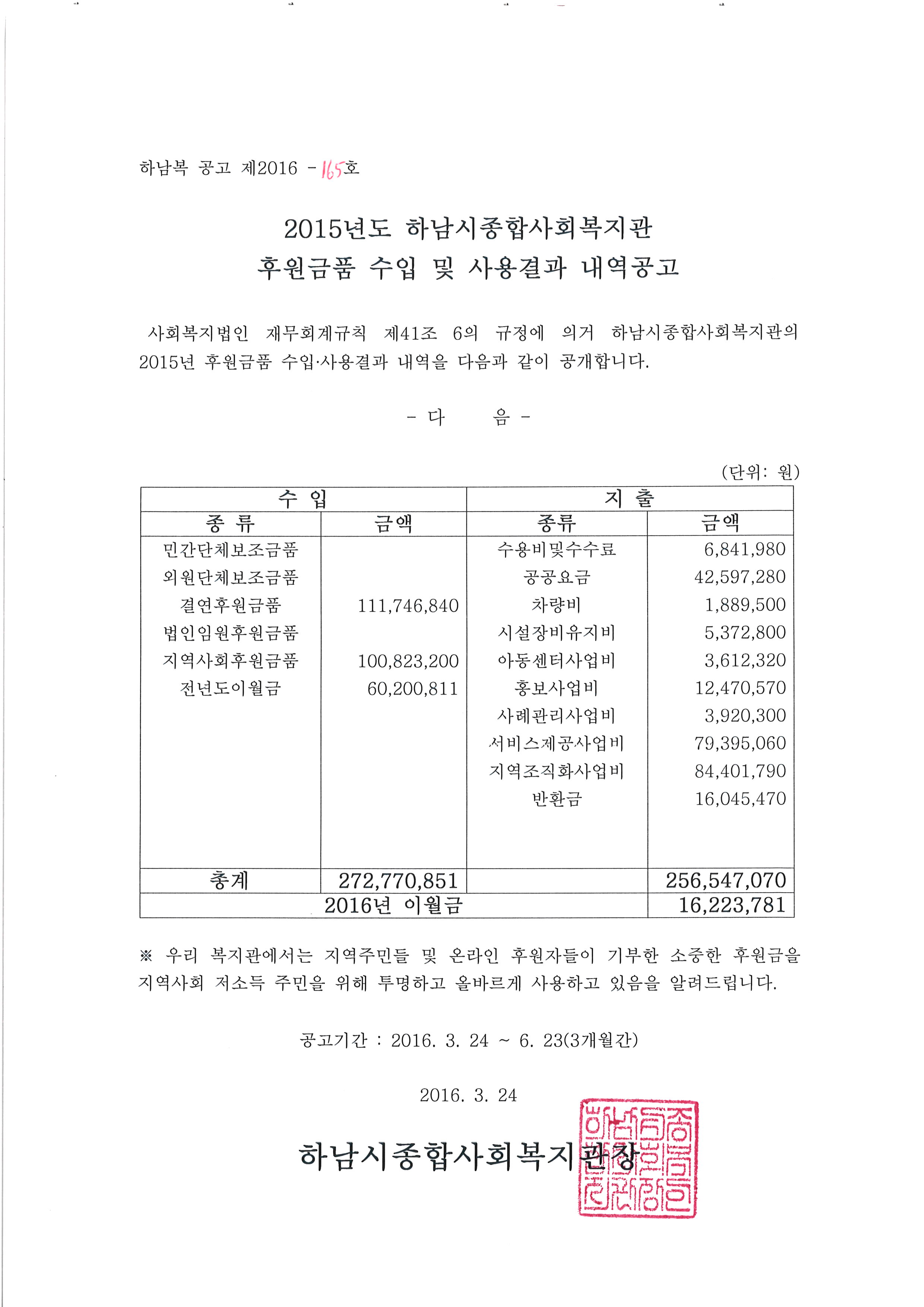 공고기간 : 2016. 3. 24 ~ 6. 23(3개월간)