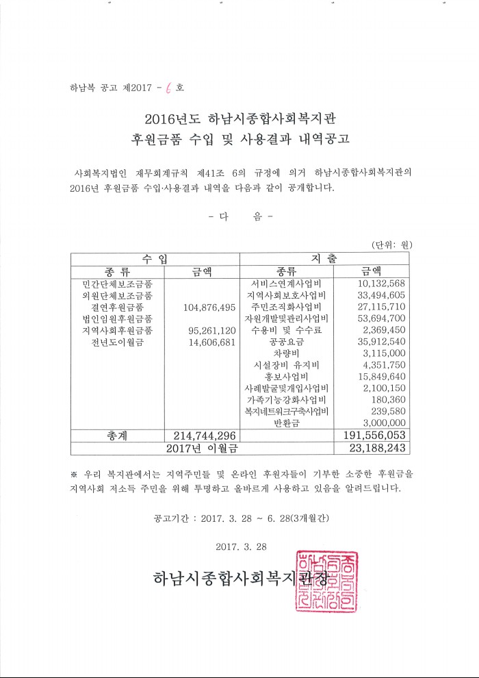2016년도 후원금품 수입․사용결과 보고서를 다음과 같이 공고합니다.
