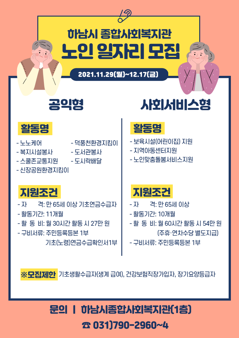 2022년 하남시종합사회복지관 노인 일자리 참여자 모집 합니다.