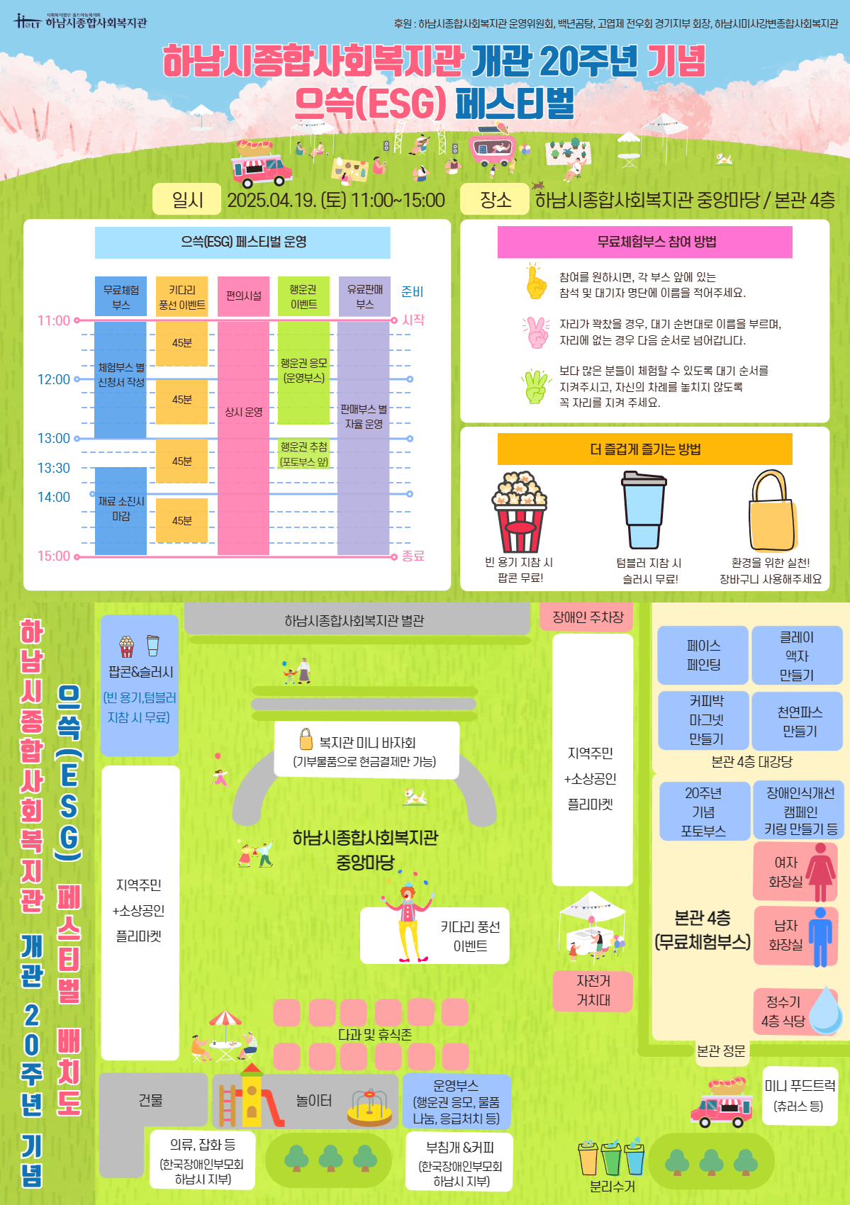 하남시종합사회복지관 개관 20주년 기념 '으쓱(ESG) 페스티벌'에 여러분을 초대합니다! 소상공인, 지역주민, 복지관이 함께하는 플리마켓이 열립니다.