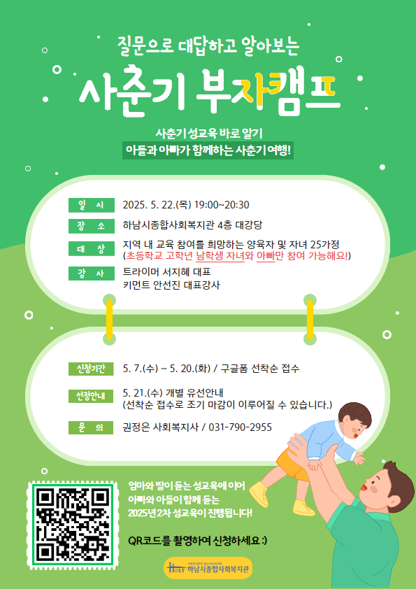 부모와 자녀가 함께 참여하는 2025년 2차 부모교육 '사춘기 부자캠프'를 진행하오니