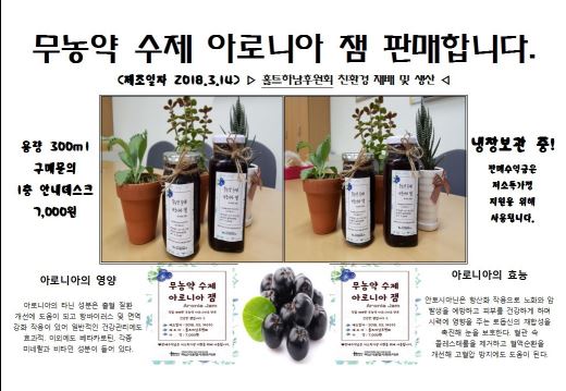 저소득가정 돕기 유기농 아로니아 쨈 판매 작성일 : 2018.03.15 | 조회수 : 12843 홀트하남후원회에서 직접 재배하고 만든 무농약 유기농 아로니아쨈을 판매하고 있습니다. 1병당 7,000원이며, 판매수익금은 홀트하남후원회 이름으로 복지관에 등록된 저소득가정 지원을 위해 전액 사용될 예정입니다. 많은 관심과 사랑 부탁드립니다.