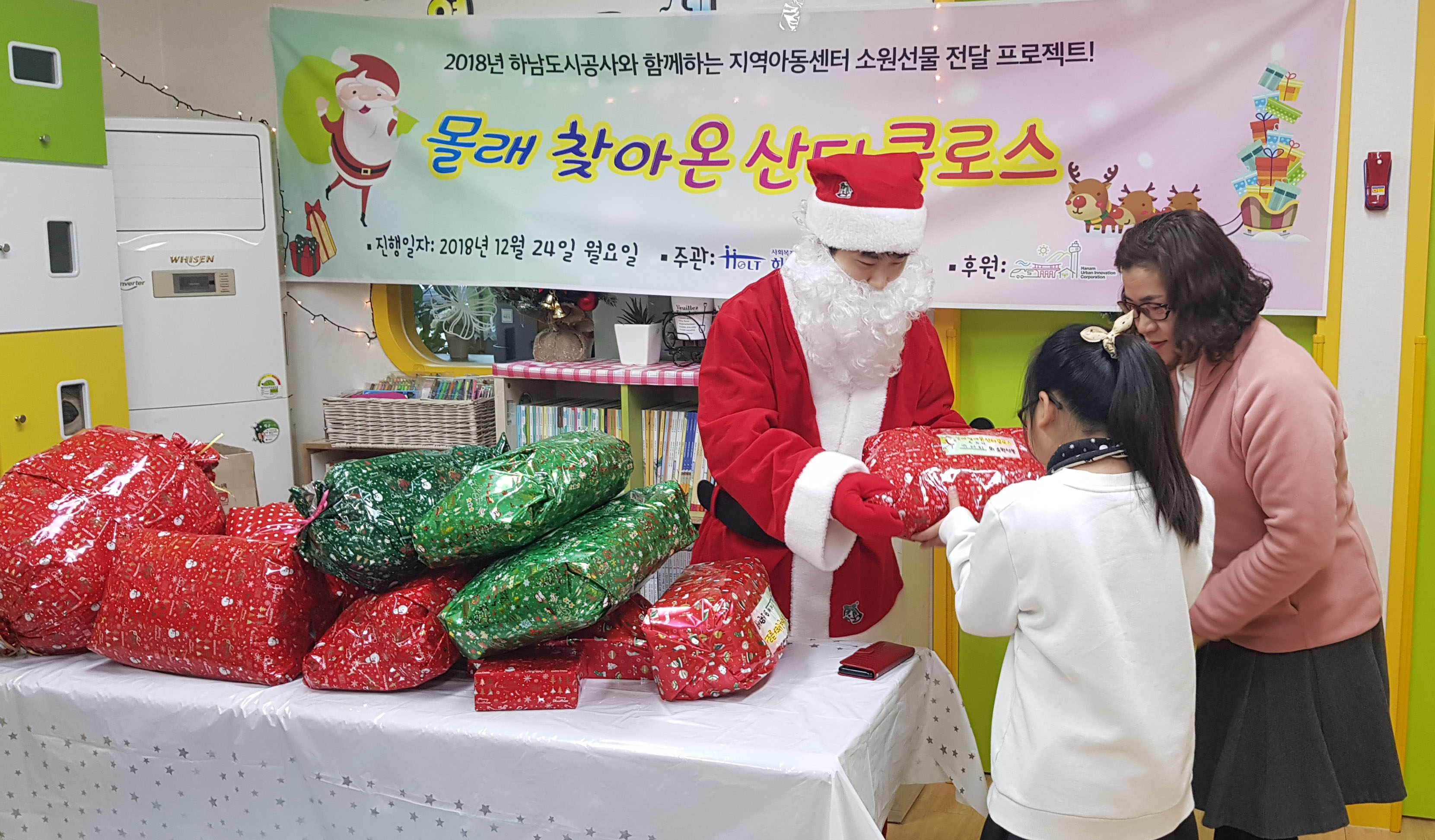 몰래 찾아온 산타클로스 작성일 : 2018.12.24 | 조회수 : 11589 2018. 12. 24(월) 15:00~18:00 하남도시공사에서 지원하는 '몰래 찾아온 산타클로스'가 진행되었습니다. 하남도시공사 직원분들이 직접 봉사로 참여하였으며, 관내 지역아동센터를 방문하여 이용 아동 및 청소년 384명에게 소원선물과 맛있는 간식을 전달하였습니다. 아이들에게 좋은 추억을 선물해준 하남도시공사에 감사드립니다.
