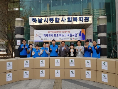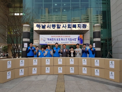 2019 저소득계층 미세먼지 보호 마스크 지원 사업 전달식 작성일 : 2019.03.19 | 조회수 : 11837 2019년 3월 19일(화) 16:00~17:00 하남시와 하남시종합사회복지관은 민관협력사업으로 취약계층 건강보호를 위해 경기사회복지공동모금회 후원으로 미세먼지 보호 마스크를 저소득 어르신 및 취약계층 3,033명에 60,660장을 행정복지센터를 통해 전달했습니다. 앞으로도 민관이 협력하여 취약가정 지원을 위해 더 힘쓰겠습니다.