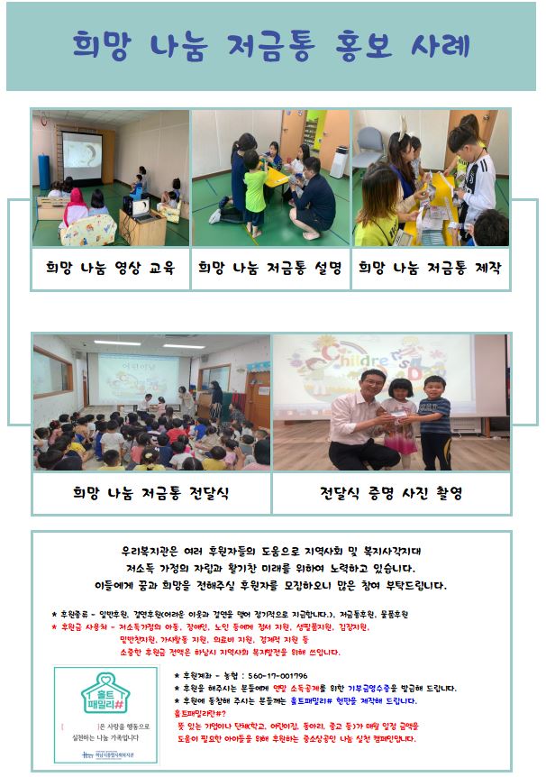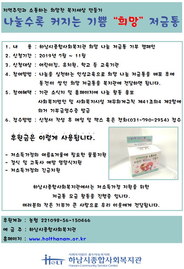 2019년 바른인성함양프로젝트 '인성의조건' 인성놀이교육 2019-07-25 조회수 11,727 홀트패밀리# 현판 전달식[투민코리아] 2019-07-24 조회수 11,848 홀트패밀리# 현판 전달식[분당끌라시꼬커피요리학원] 2019-07-24 조회수 12,305 홀트패밀리# 현판 전달식[신용보증기금 하남지점] 2019-07-24 조회수 12,024 홀트패밀리# 현판 전달식[삼성튼튼마취통증의학과의원] 2019-07-24 조회수 11,631 나눌수록 커지는 기쁨 "희망"저금통 2019-07-16 조회수 12,218 2019년 바른인성함양프로젝트 '인성의조건' 인성함양 숲 2019-07-03 조회수 11,802 2019 건강한 여름나기 물품지원 2019-07-03 조회수 11,634 2019년도 은퇴 후 취업준비교육(상반기) 실시 2019-07-01 조회수 11,613