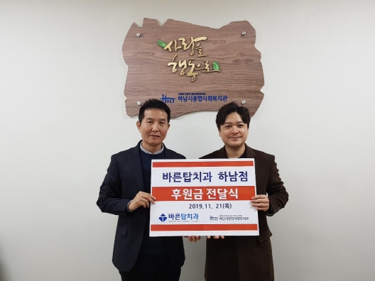 바른탑치과(하남점) 후원금 전달식 작성일 : 2019.11.21 | 조회수 : 12027 2019년 11월 21일(목) 9:00~9:30 하남바른탑치과 장진규 원장님께서"좋은곳에 사용되길 바랍니다."며, 소중한 후원금을 복지관에 후원해 주셨습니다. 매년 분기별 잊지 않고 나눔을 실천하시는하남바른탑치과 장진규 원장님과 직원분들께 감사드리며,본 후원금은 하남시 지역내 저소득가정 지원에 사용 하겠습니다. 후원에 다시한번 감사드립니다.