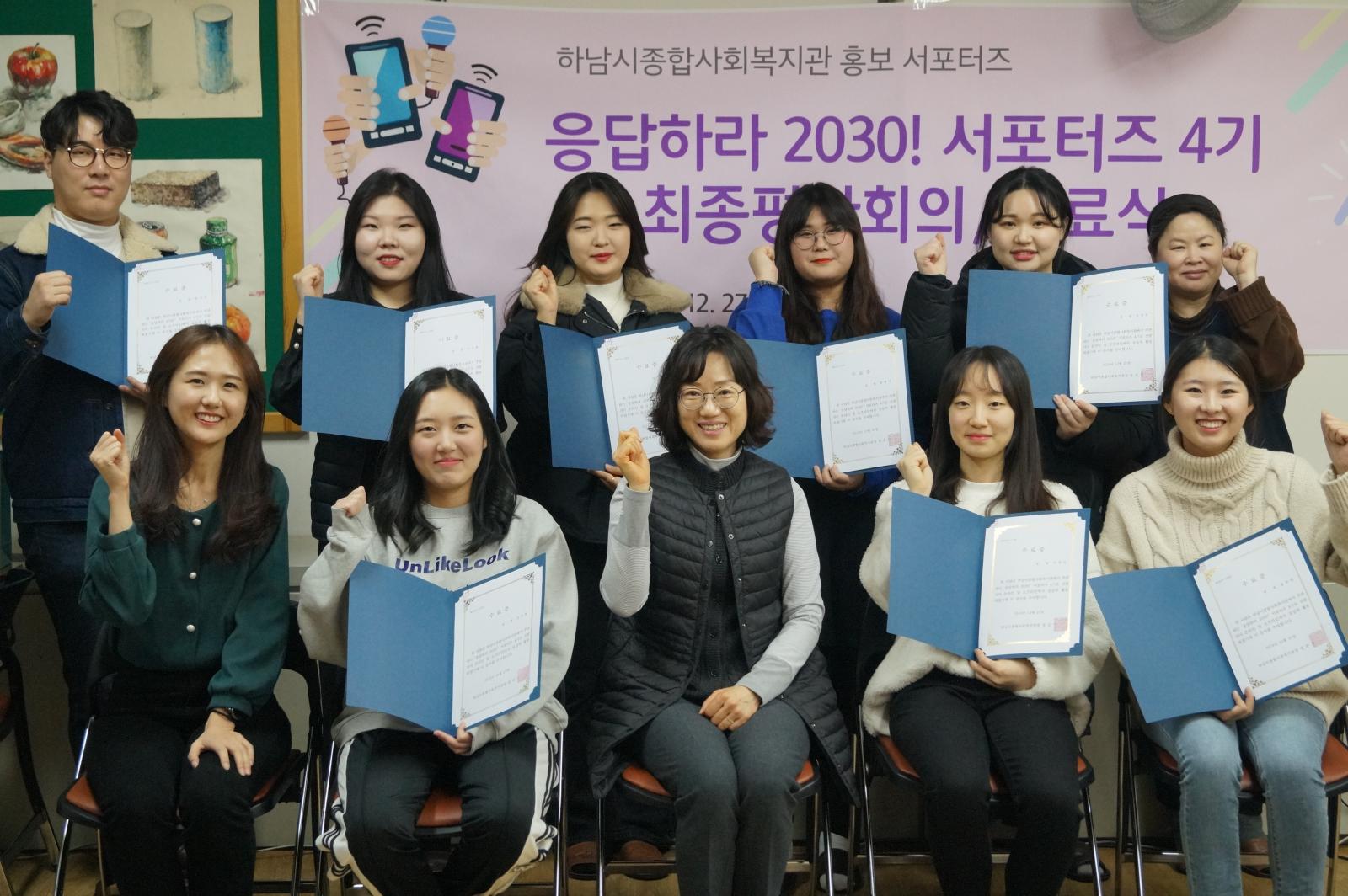 응답하라2030!서포터즈 4기 수료식 및 최종평가회의 작성일 : 2019.12.27 | 조회수 : 13245 응답하라 2030! 서포터즈 4기의 최종평가회 및 수료식을 진행하였습니다.수료증 전달과 우수활동가를 시상하고, 그동안의 활동을 되돌아보는 시간을 가졌습니다.한 해동안 복지관의 홍보 활성화를 위해 함께해준 4기에게 감사의 마음을 전합니다.