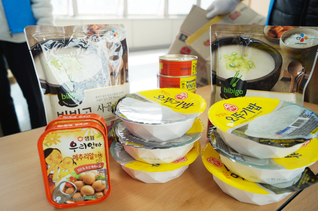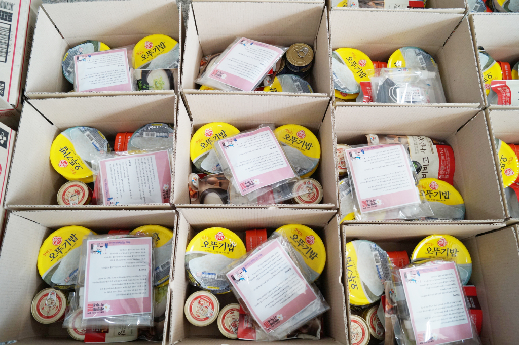 완성된 키트는 정기적으로 후원해주시는 킴스프라이스의 라면과 함께
