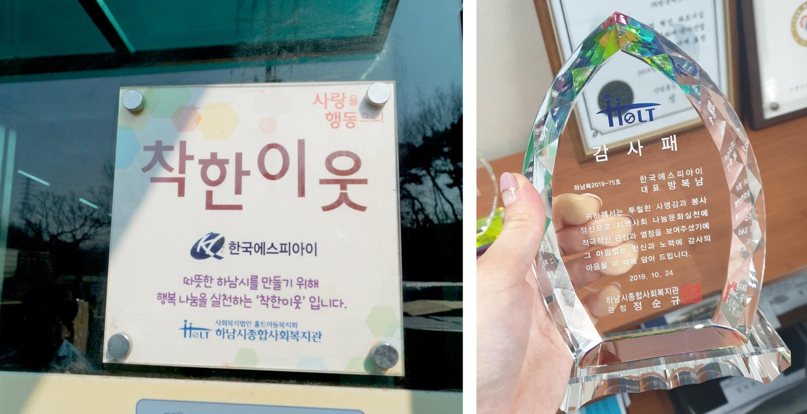 복지관에서 전달한 착한이웃 현판과 감사패 등