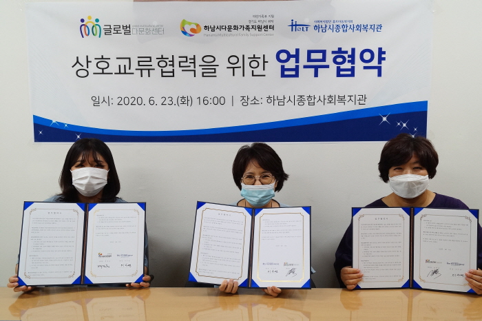 글로벌다문화센터, 하남시다문화가족지원센터 업무협약 체결 작성일 : 2020.06.26 | 조회수 : 13481 글로벌다문화센터, 하남시다문화가족지원센터와 함께 지역사회 내 다문화 이주민 및 가족의 복지향상과 사회복지서비스 지원을 위해 업무협약을 체결하였습니다. 패션플러스 후원, 경기도사회복지관협회 지원으로 각 센터에 생리용품을 15박스씩 전달해드렸습니다. 앞으로 하남시 내 다문화 가족과 아동들의 행복을 위해 협력하고 노력하는 기관이 되겠습니다.