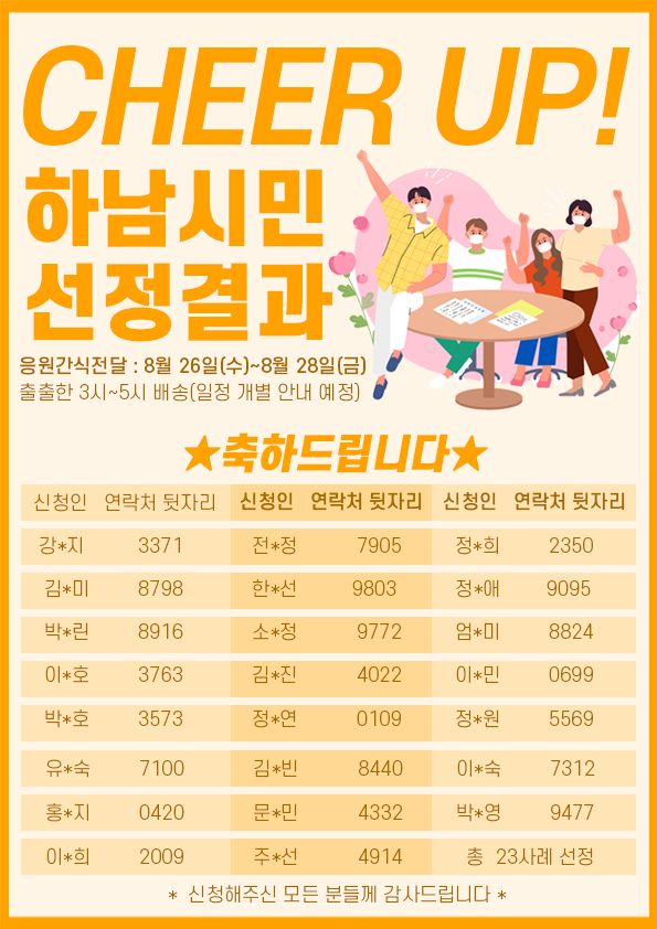 CHEER UP! 하남시민! : 사연응모 결과발표 작성일 : 2020.08.20 | 조회수 : 13433 더 자세한 이야기를 보고싶다면 아래 글씨를 클릭해주세요 : )응원후기 바로가기(클릭!)