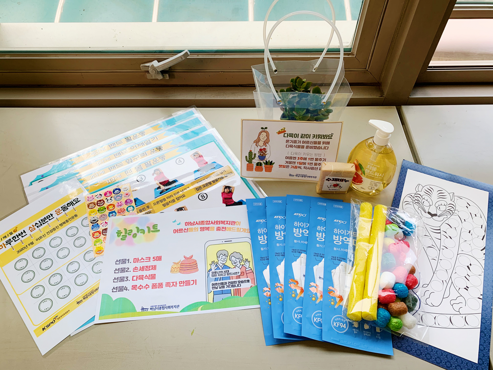 마스크 5매, 손 세정제, 다육식물, 수제비누, 플레이콘(옥수수 폼폼) 족자 만들기를 준비하여
