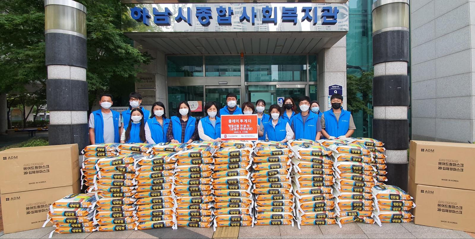 (주)플레이투게더 후원물품 전달식 작성일 : 2020.09.17 | 조회수 : 12175 (주)플레이투게더 에서 후원물품을 지원해 주셨습니다.이희수 대표는 “명절에 소외된 우리 이웃에게 조금이나마 도움이 되었으면 좋겠다.”고 전했습니다. 후원해 주신 소중한 후원물품(백미10kg 200포 및 마스크 10,000장)은 저소득 가정에 전달될 수 있도록 하겠습니다.