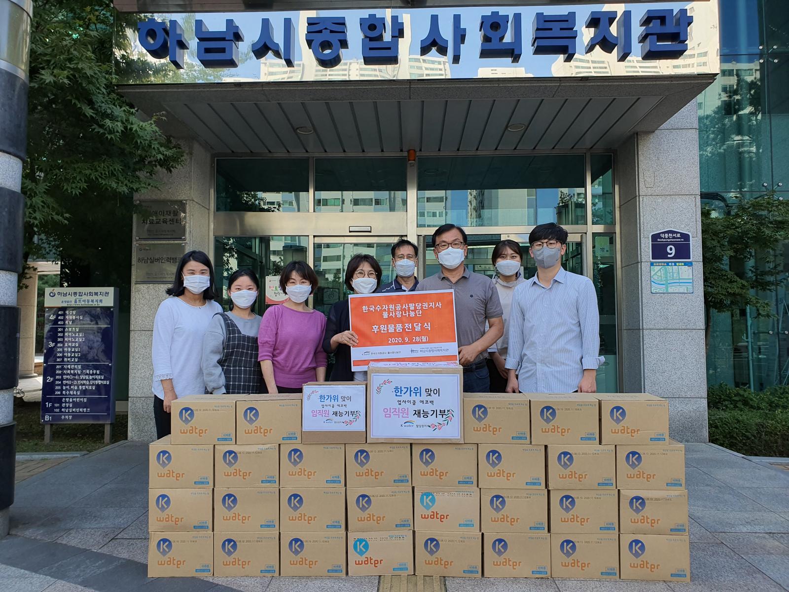 한국수자원공사 팔당권지사 후원물품 전달식 작성일 : 2020.09.28 | 조회수 : 13578 한국수자원공사 팔당권지사 에서 후원물품을 지원해 주셨습니다.박정수 지사장은 “경제적·환경적으로 어려움을 겪고 있는 가정에 희망을 전달하는 소중한 기회가 되기를 바란다. 앞으로도 취약계층 지원을 위한 다양한 사회공헌활동을 추진하겠다.”고 전했습니다. 후원해 주신 소중한 장학금과 후원물품(병물)은 저소득 가정에 전달될 수 있도록 하겠습니다.