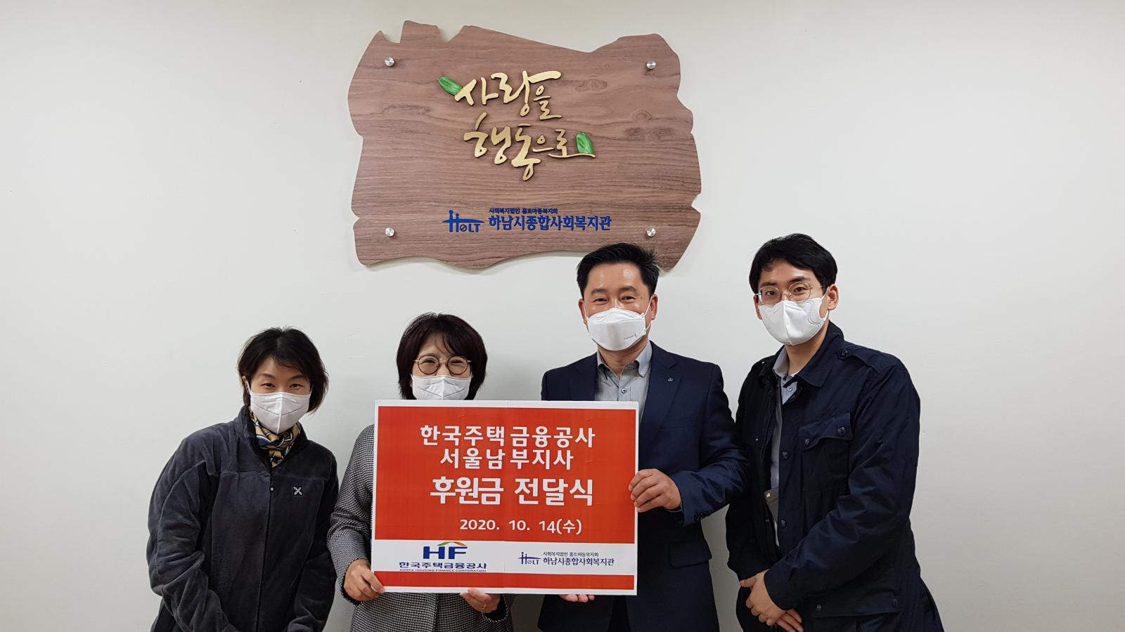한국주택금융공사 서울남부지사 후원금 전달식 작성일 : 2020.10.15 | 조회수 : 12684 한국주택금융공사 서울남부지사에서 후원금을 지원해 주셨습니다.김진구 지사장은 “어려운 상황에 도움이 손길이 잘 닿지 않는 사각지대 가정에 조금이나마 도움이 되었으면 좋겠다."고 전했습니다. 후원해 주신 소중한 후원금은 결식 위험에 노출되어 있는 어르신 가정에 김장김치로 전달하겠습니다.