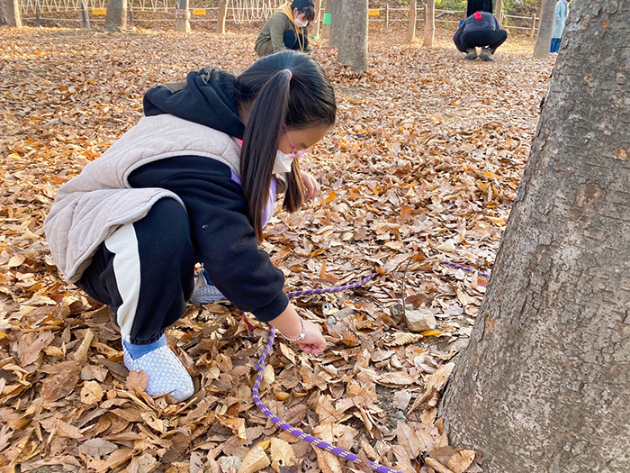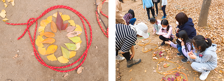 밧줄을 활용하여 나뭇잎 무지개를 만들어 보았네요!
