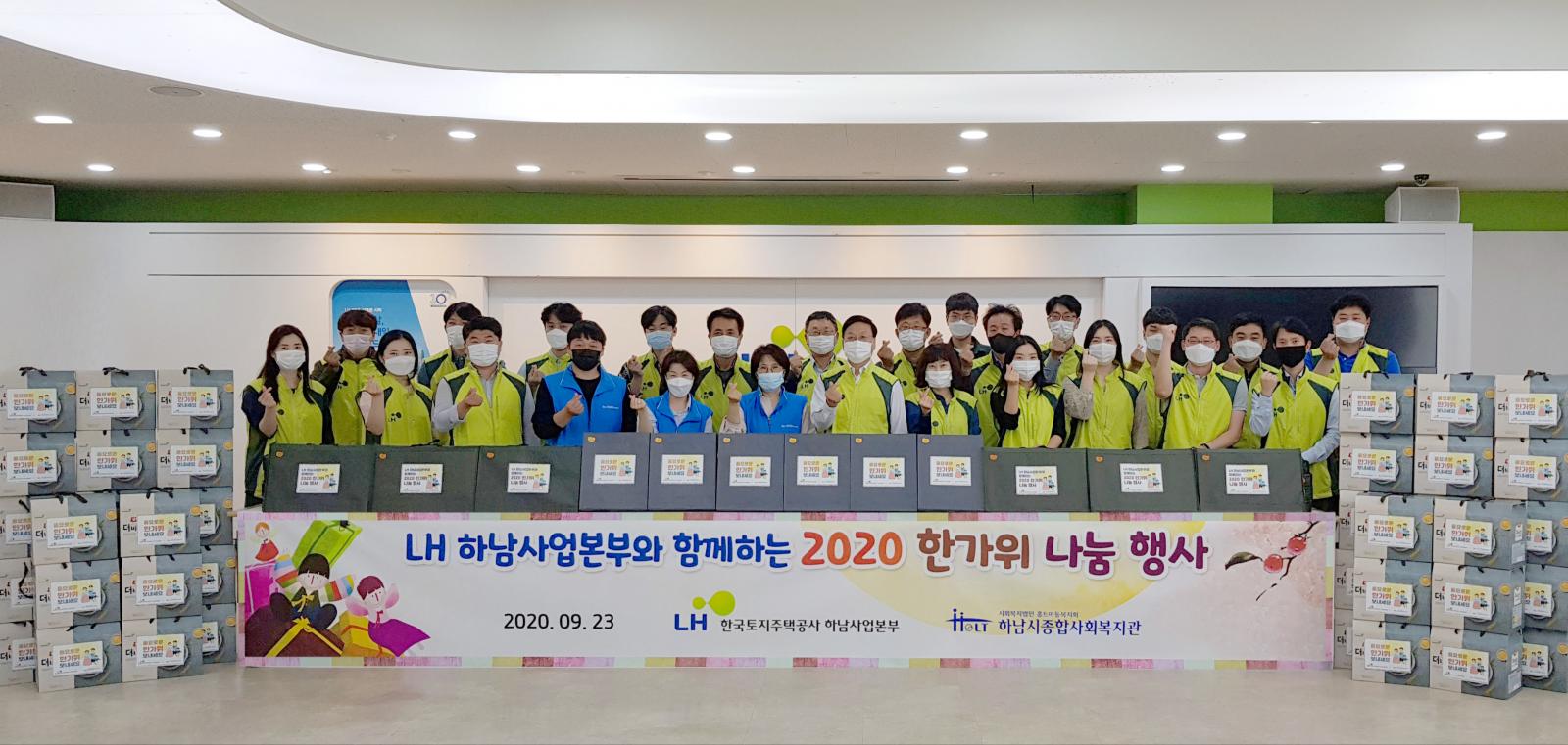LH한국토지주택공사 하남사업본부 명절선물 전달식 작성일 : 2020.09.23 | 조회수 : 10941 LH한국토지주택공사 하남사업본부에서 명절선물을 지원해 주셨습니다.박정우 본부장은 “이번 한가위 나눔 행사를 통해 코로나19로 어려움을 겪고 있는 가정에 힘이 되기를 바란다."고 전했습니다. 후원해 주신 소중한 후원물품은 명절에 소외된 저소득가정에 전달하겠습니다.