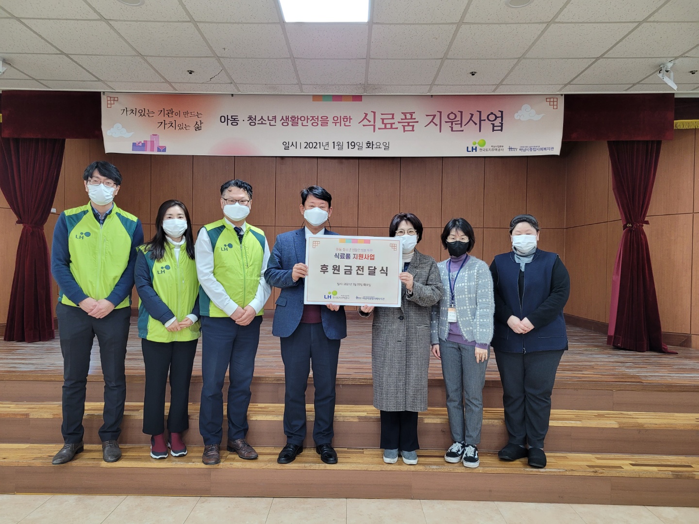 LH한국토지주택공사 하남사업본부 후원금 전달식 작성일 : 2021.01.18 | 조회수 : 12509 LH한국토지주택공사 하남사업본부 유석태 본부장님과 임직원분들이 함께"코로나19에 어려움을 겪고 있는 한부모 및 조손가정에 도움이 되고 싶다."며, 소중한 후원금을 복지관에 후원해 주셨습니다. 본 후원금은 하남시 지역내 한부모 및 조손가정에 식료품키트를 구성하여 잘 전달 하겠습니다. 후원에 다시한번 감사드립니다.