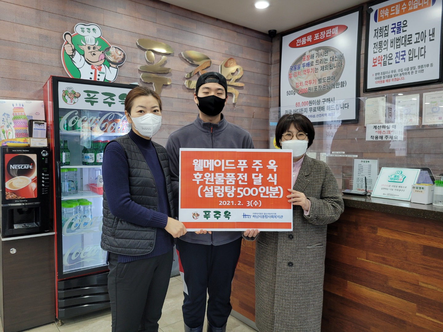 웰메이드 푸주옥[하남점] 설렁탕 500인분 전달식 작성일 : 2021.02.03 | 조회수 : 12554 웰메이드 푸주옥[하남점] 송한모 사장님과 직원분들이 함께"작은 정성이지만 맛있게 드시고 건강하시길 바란다."며, 설렁탕 500인분을 복지관에 후원해 주셨습니다. 어르신들의 든든한 한끼가 될 수 있도록 가정에 잘 전달 하겠습니다. 소중한 후원에 다시한번 감사드립니다.