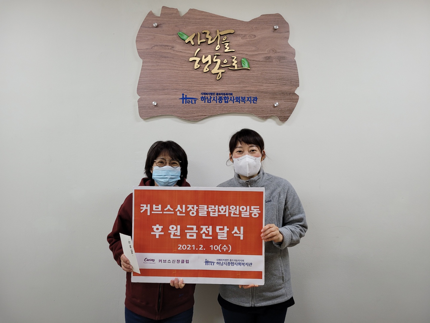 커브스 신장클럽 하남시종합사회복지관 후원금 전달 작성일 : 2021.02.10 | 조회수 : 12429 커브스 신장클럽(대표 김선화) 회원들이 함께"코로나19 여파로 더욱 외롭고 힘들 시기를 보내는 우리 이웃들에게 도움이 되기를 바란다."며,회원들이 직접 기부한 후원금을 복지관에 후원해 주셨습니다.하남시 지역내 저소득가정 지원을 위해 사용하겠습니다. 후원에 다시한번 감사드립니다.