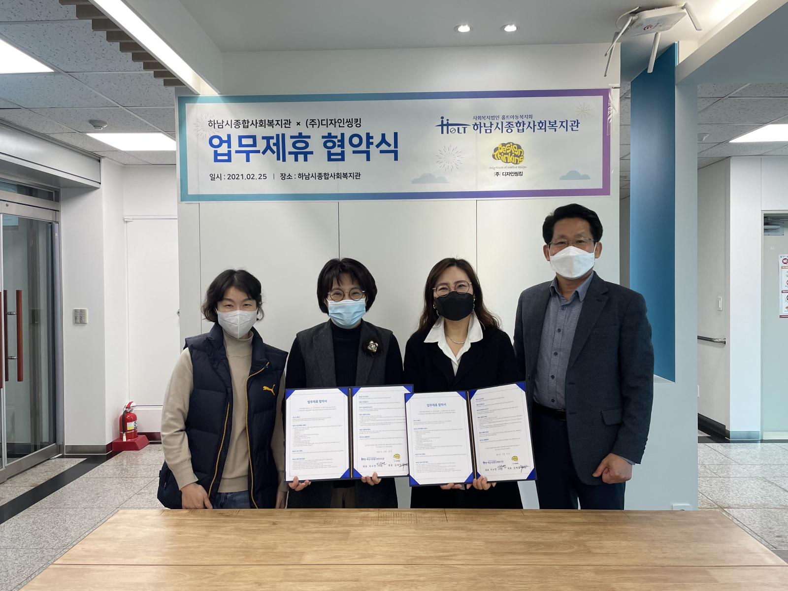 (주)디자인씽킹 업무협약식 진행 작성일 : 2021.02.25 | 조회수 : 11900 (주)디자인씽킹과 함께 대상자별 맞춤형 힐링프로그램을 지역주민들에게 제공하기 위한 업무협약식을 진행하였습니다.복지관에서는 지역주민들의 건강한 마음을 위해다양한 마음건강 프로그램을 제공하도록 노력하겠습니다.