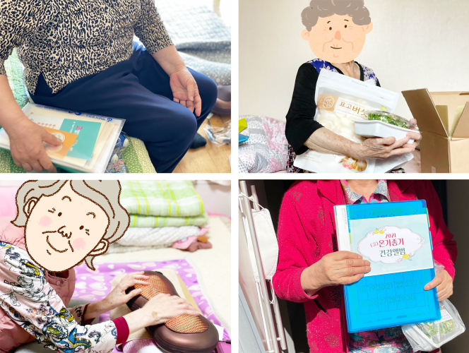 ① 노인 건강 체조(종이안내문, 영상, 건강박스) ② 고혈압/당뇨병/치매 등 건강 정보 전달 ③ 노인우울증 예방을 위한 힐링 프로그램 ④ 어르신 영양 개선을 위한 밑반찬 제작 * 건강정보 관련 자료는 |