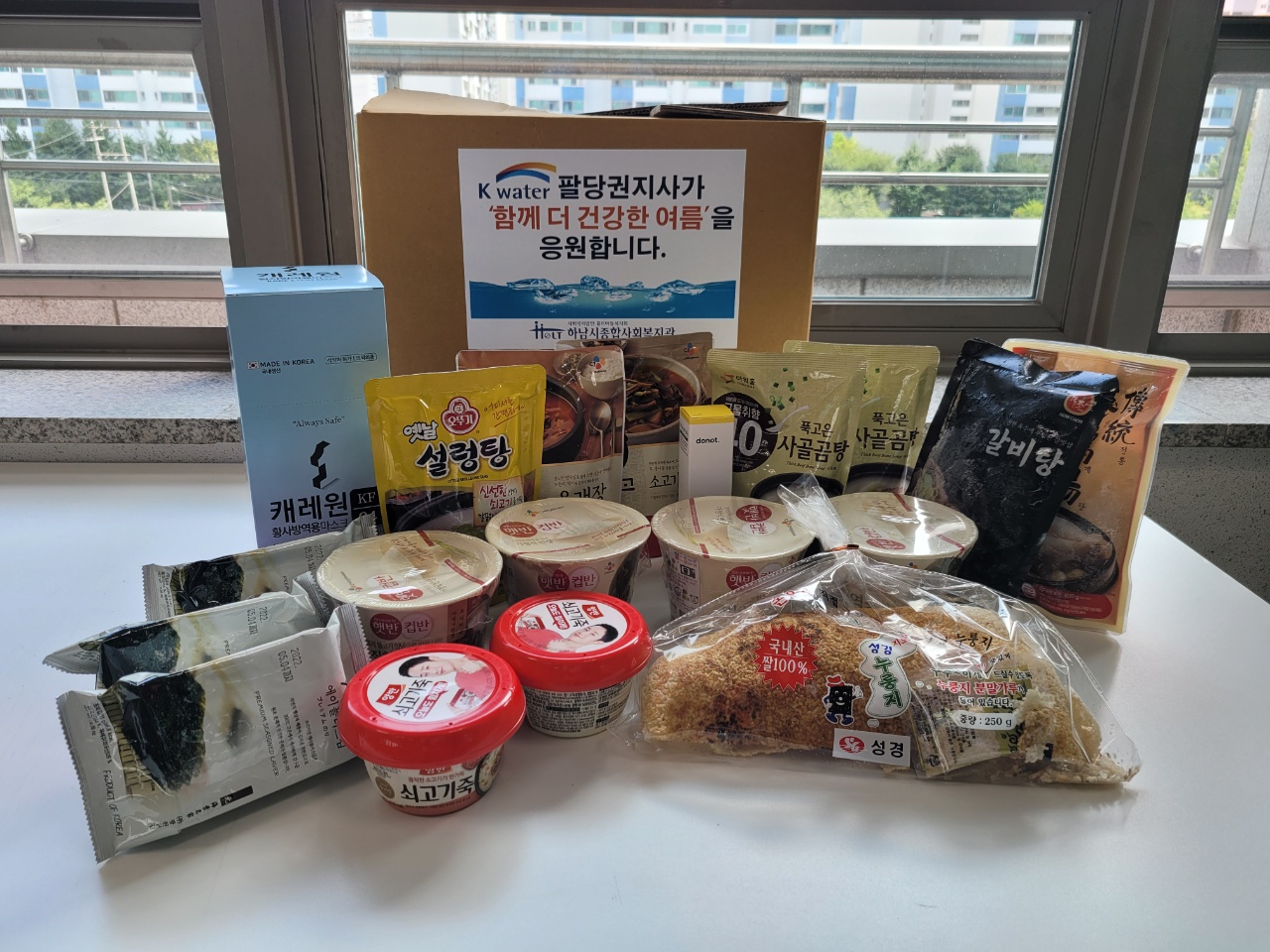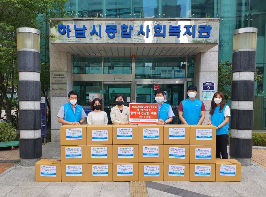한국수자원공사 팔당권관리단 '함께 더 건강한 여름' 물품 전달식 작성일 : 2021.08.20 | 조회수 : 10278 15종으로 구성된 식료품보양키트 포장한국수자원공사 팔당권지사(지사장 박정수) 임직원분들이 함께"코로나19와 폭염으로 힘든 시간을 보내고 있는 이웃의 건강관리에 도움이 되었으면 좋겠다."며,원기회복을 위한 보양키트를 복지관에 후원해 주셨습니다.보양키트는 하남시 지역내 저소득가정에 잘 전달 하겠습니다.후원에 다시한번 감사드립니다.