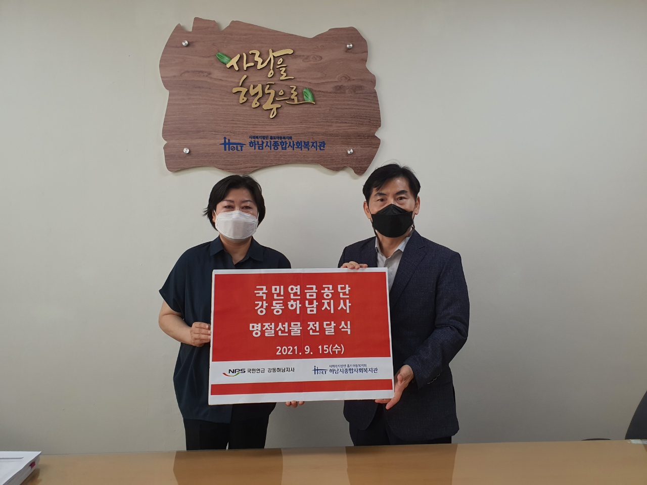국민연금공단 강동하남지사 온누리상품권 전달식 작성일 : 2021.09.16 | 조회수 : 9322 국민연금공단 강동하남지사에 명절선물(온누리상품권)을 지원해 주셨습니다.권대식 지사장은 “추석 명절에 소외되고 어려움을 겪고 있는 분들께조금이나마 도움이 됐으면 좋겠다. 모두들 힘내시길 바란다."고 전했습니다. 후원해 주신 소중한 명절선물(온누리상품권)으로 관내 소외계층을 향한 온정의 마음이 잘 전달 될 수 있도록 하겠습니다.
