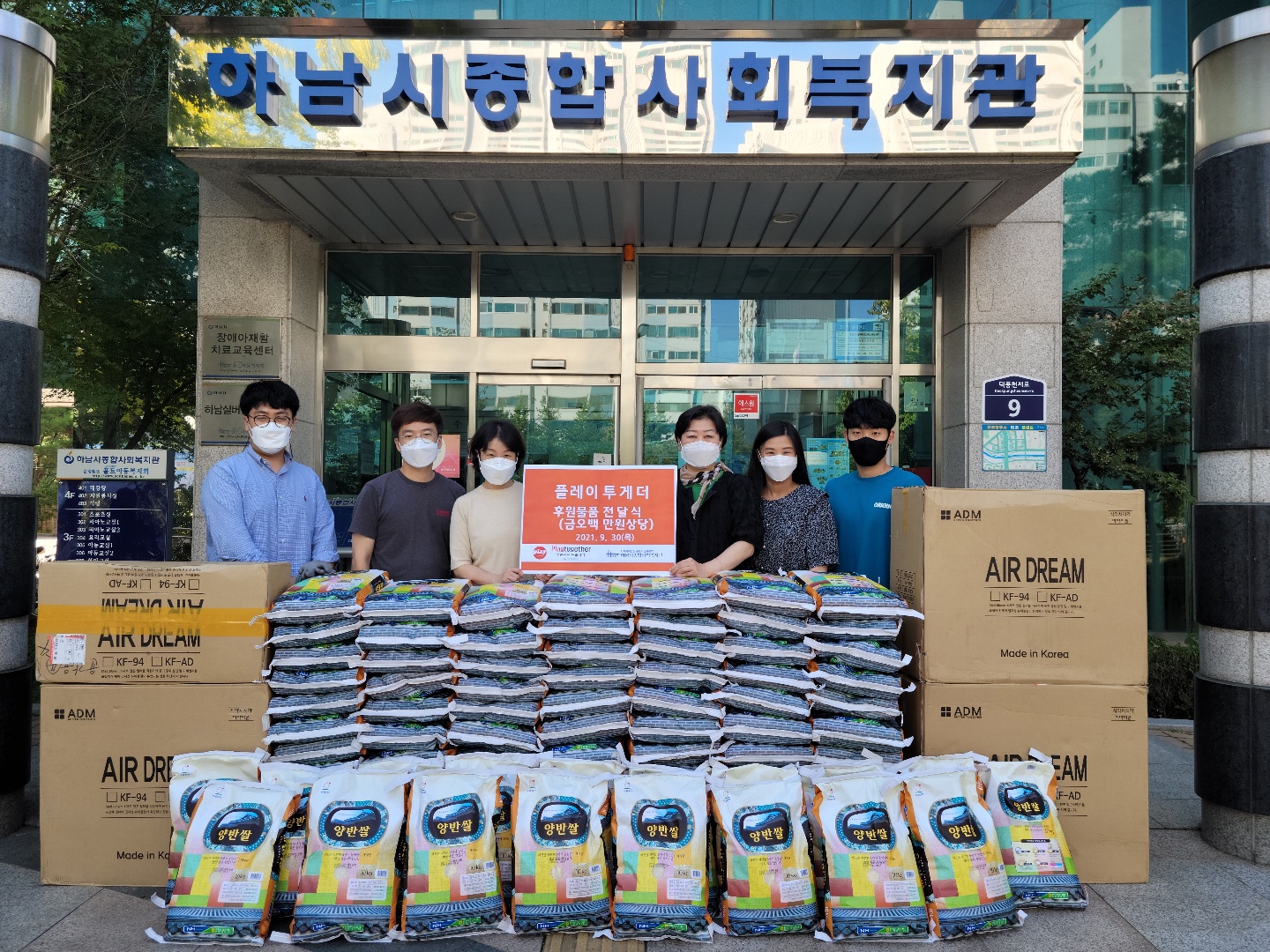 (주)플레이투게더 후원물품 전달식 작성일 : 2021.09.30 | 조회수 : 9622 (주)플레이투게더 에서 후원물품을 지원해 주셨습니다.이희수 대표는 “우리 이웃에게 조금이나마 도움이 되고 싶다.”고 전했습니다. 후원해 주신 소중한 후원물품(백미10kg 100포 및 마스크 5,000장)은 저소득 가정에 전달될 수 있도록 하겠습니다.