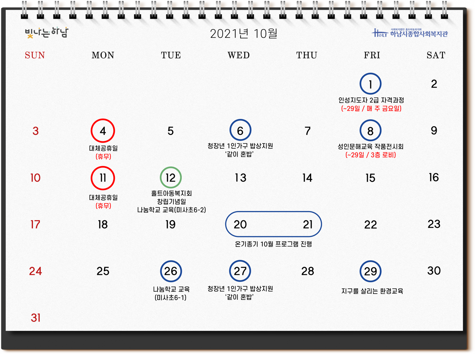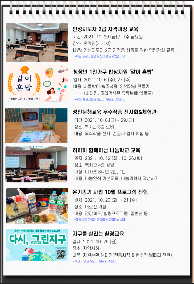 '하종복 게임' 참여자 모집 최종 명단 2021-11-09 조회수 9,151 하남시종합사회복지관 10월 월간소식 2021-11-03 조회수 8,744 2021 공정무역 한마당 2021-11-01 조회수 10,016 서울서문교회와 업무협약(MOU) 체결 2021-10-27 조회수 10,248 체험! 디지털 삶의 현장 활동 시작 2021-10-26 조회수 9,462 ‘세이브 아프간 위민' 챌린지 2021-10-15 조회수 9,515 2021년 한글날 기념 행사 진행(캘리,오프라인 우수작품 전시회) 2021-10-08 조회수 8,266 2021년 온라인 우수작품 전시회 2021-10-05 조회수 10,596 하남시종합사회복지관 9월 월간소식 2021-09-30 조회수 9,478