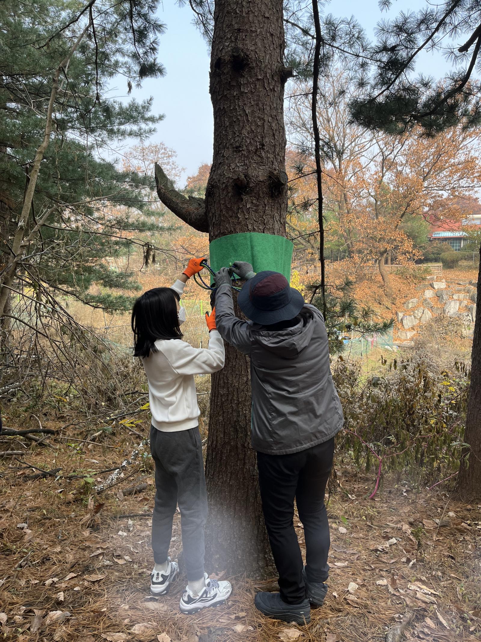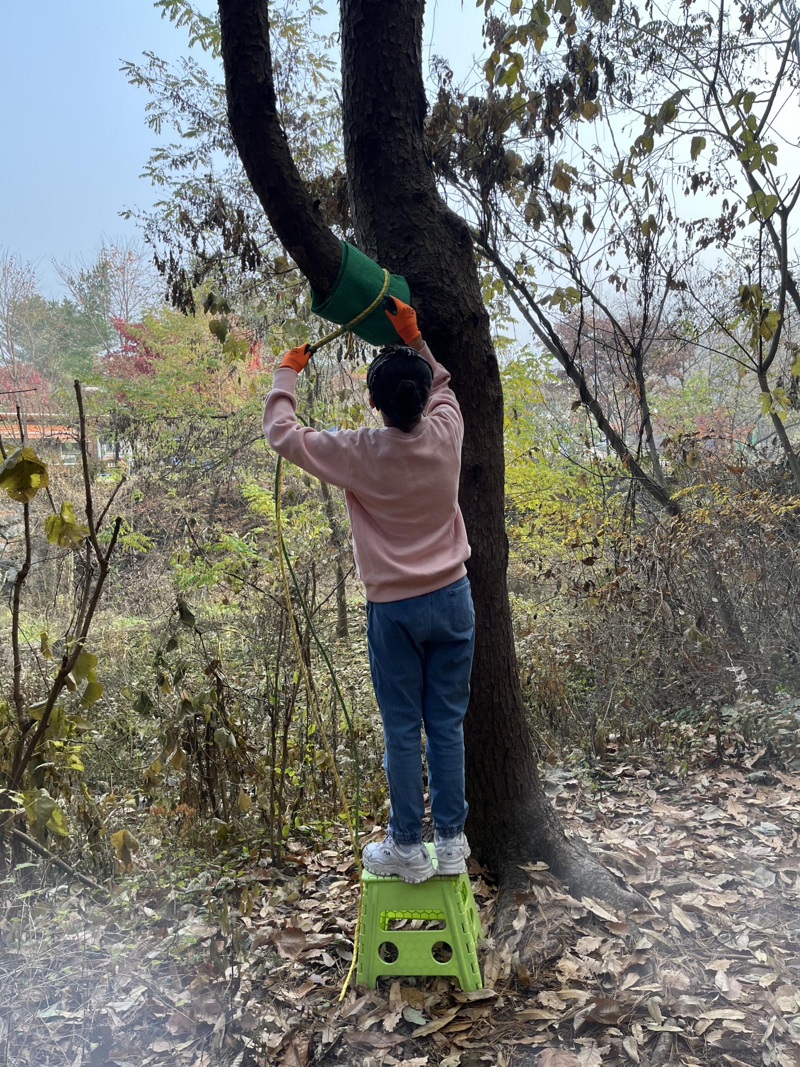 나무 보호를 위해 보호대를 설치하고, 매듭을 만들어 밧줄을 나무에 묶어줍니다.