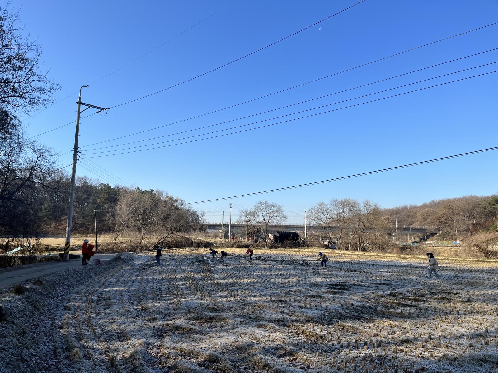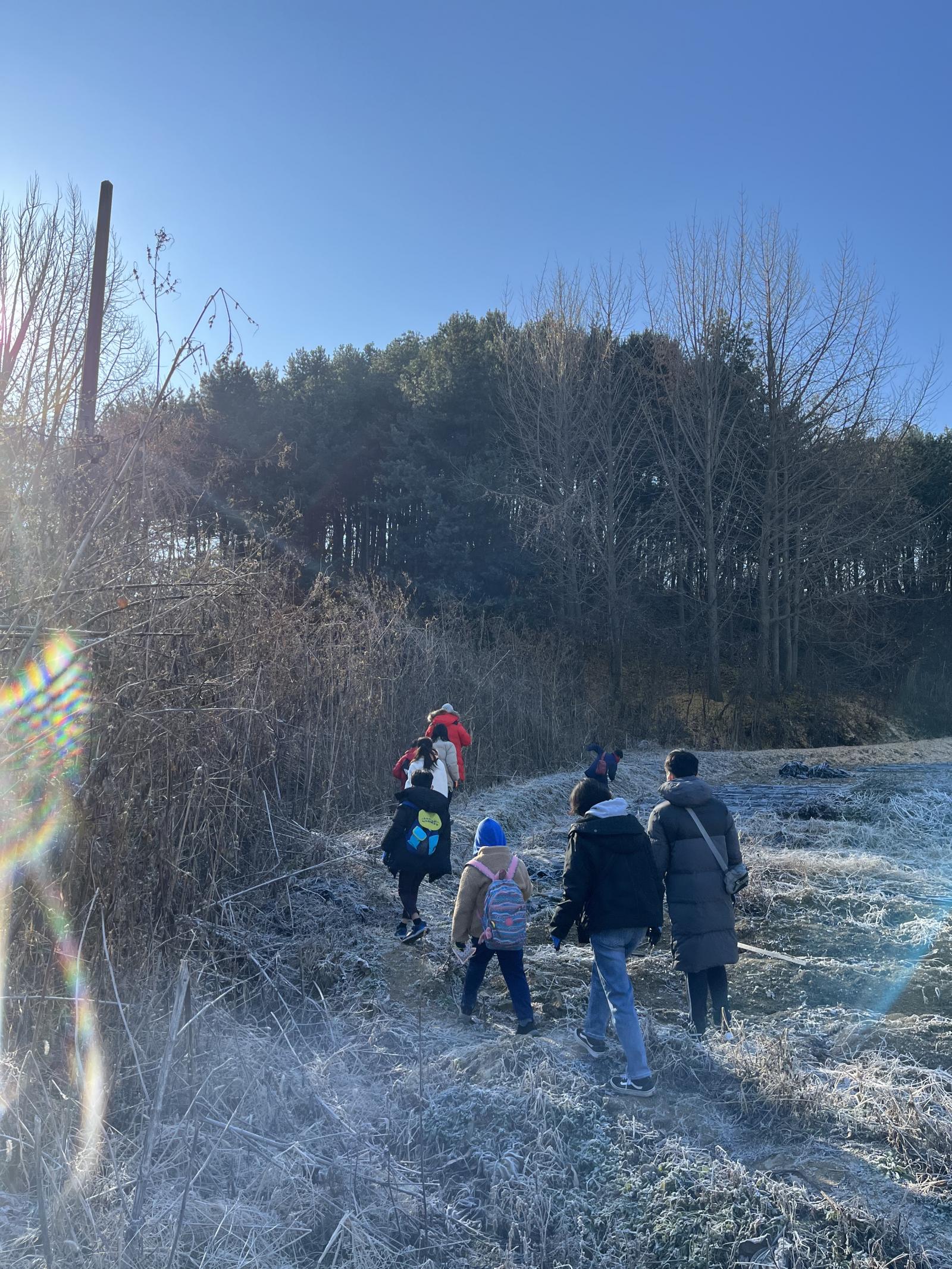 산에서 내려와 시골 마을 길을 따라 걸으며, 가을걷이가 끝난 논에서 자유시간을 가졌습니다.