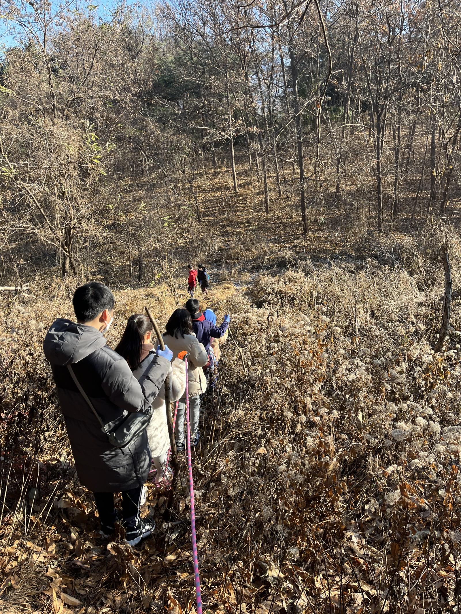 오늘은 산을 오르기로 했습니다. 내리막 길은 밧줄을 잡고 차례 차례 줄지어 내려갑니다.