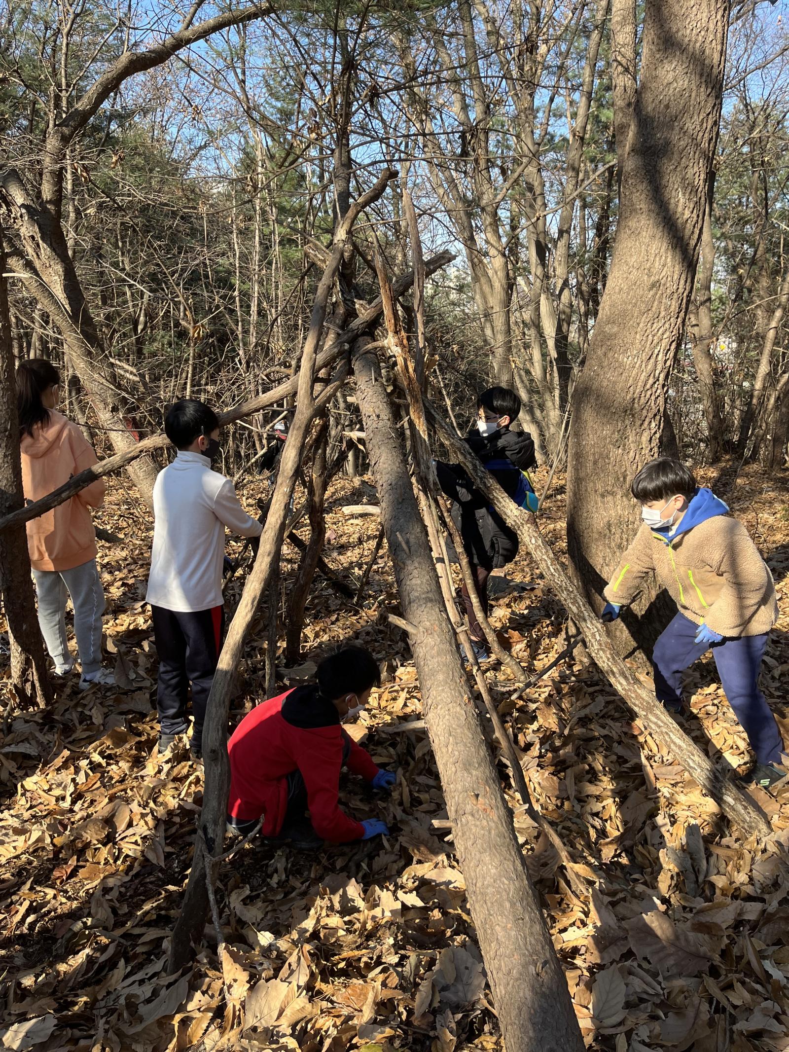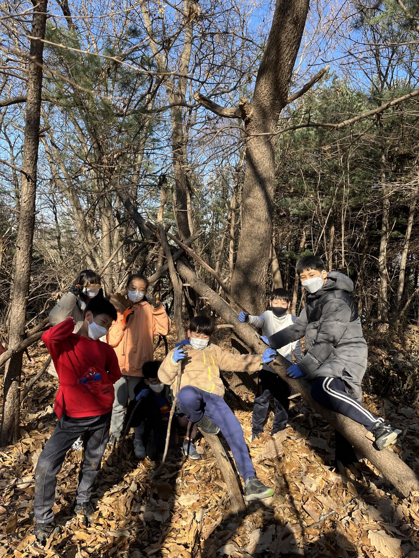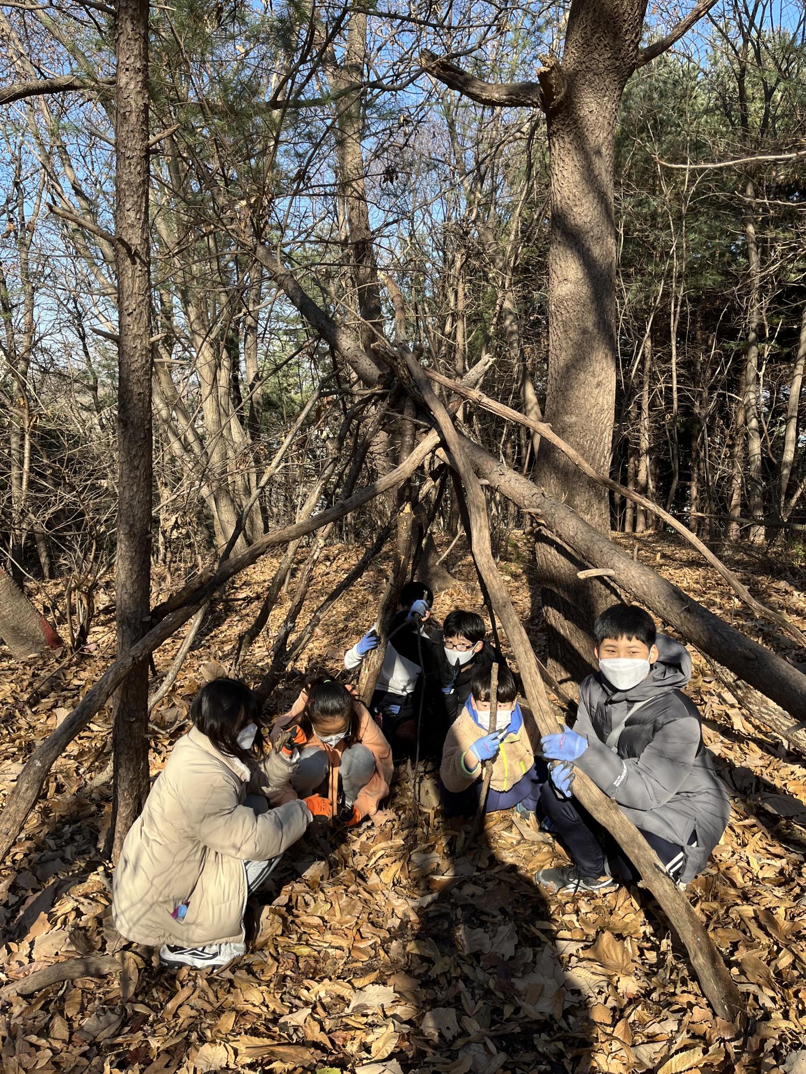자유 시간 후 다시 산에 올라 나무를 이용해 나무집도 만들었습니다.