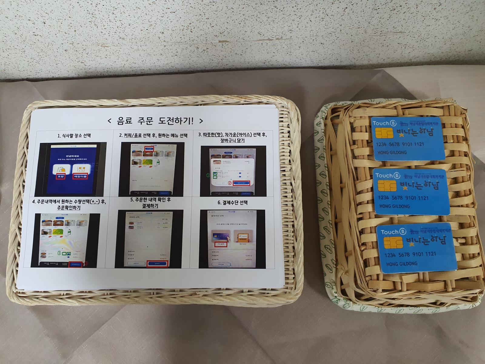 손 소독제 사용 후, 키오스크 사용 설명서와 연습용 카드를 챙기고