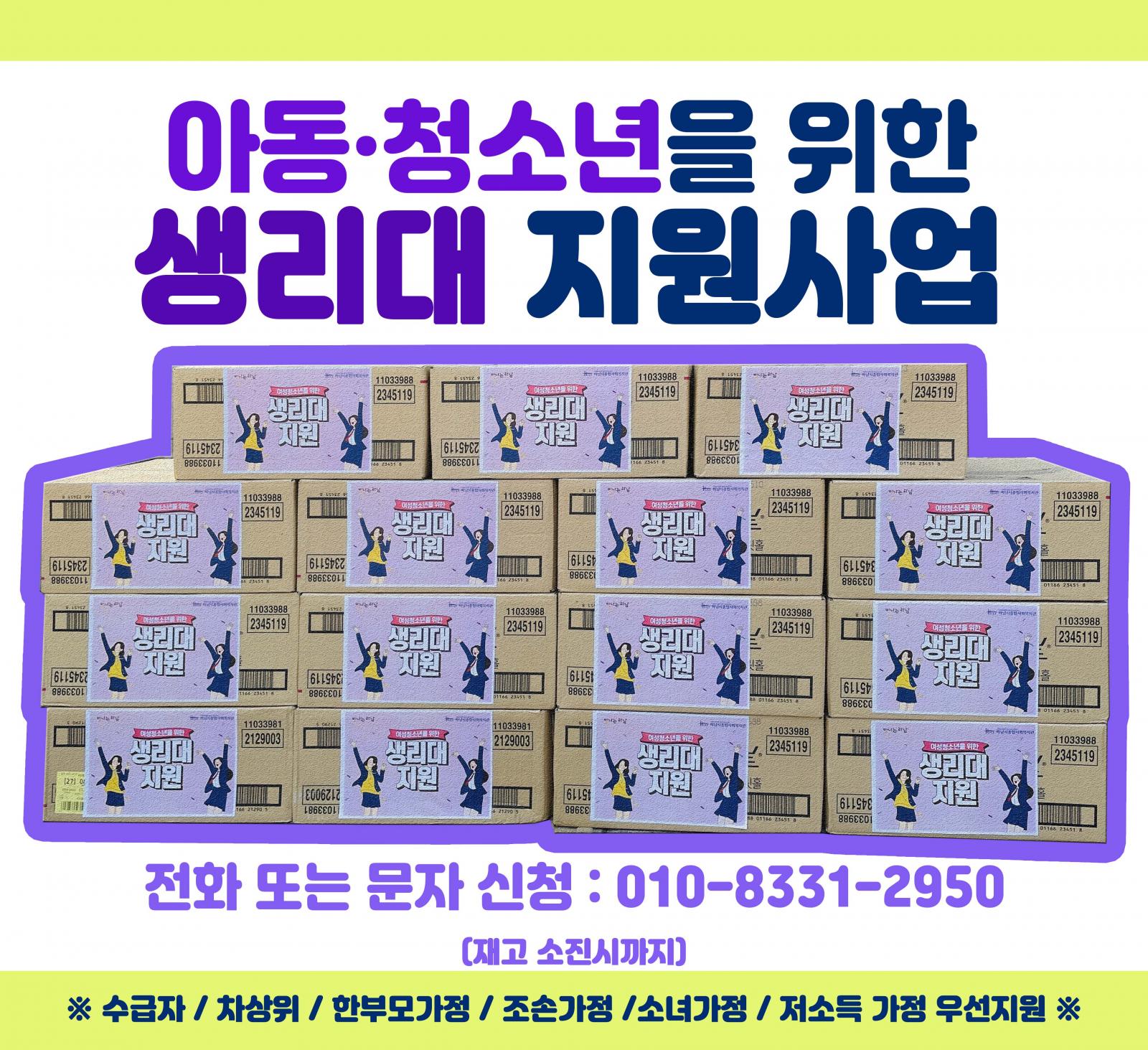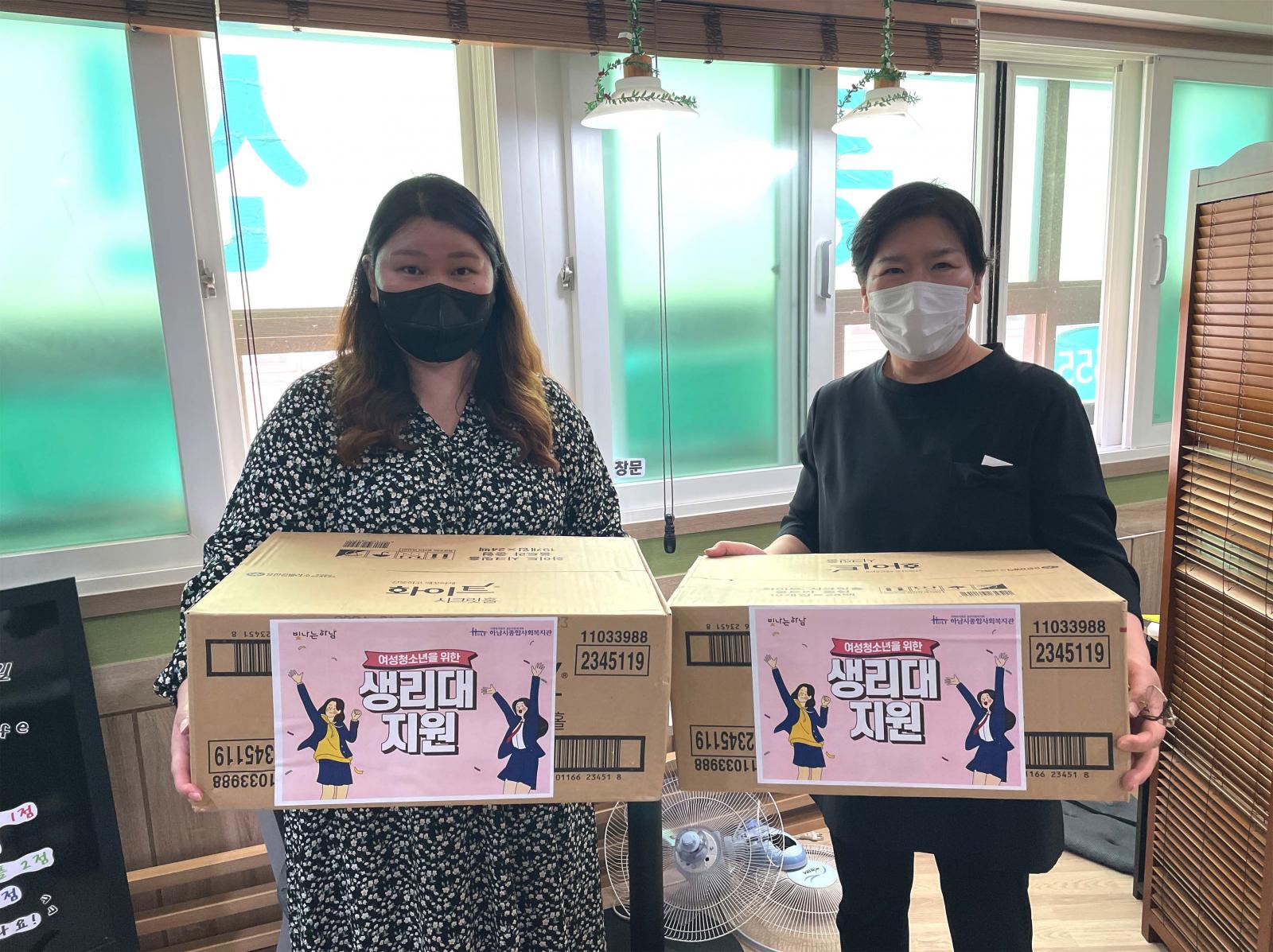 아동청소년을 위한 생리대 지원 실시 작성일 : 2022.06.08 | 조회수 : 8213 하남시 지역 내 아동과 청소년들을 위한 생리대를 지원하고 있습니다.생리대 구입에 어려움이 있는 친구들이 쉽게 접근할 수 있도록 전화 또는 문자로도 신청받고 있으니 언제든지 편한 방법으로 연락 주세요~!