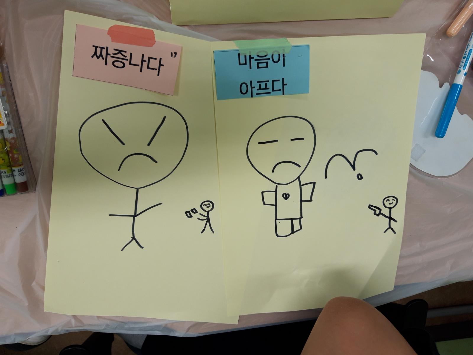 부정적 카드를 고르고 부정적 감정을 그림으로 표현한 후 이야기를 나누었어요.