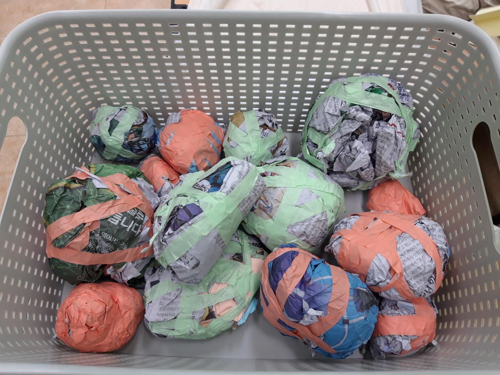 내가 그린 부정적 감정 그림을 찢고 구기고 뭉쳐 공을 만들어 2개의 팀을 나눠 팀게임(감정 쓰레기통에 공 넣기)도 하였어요.