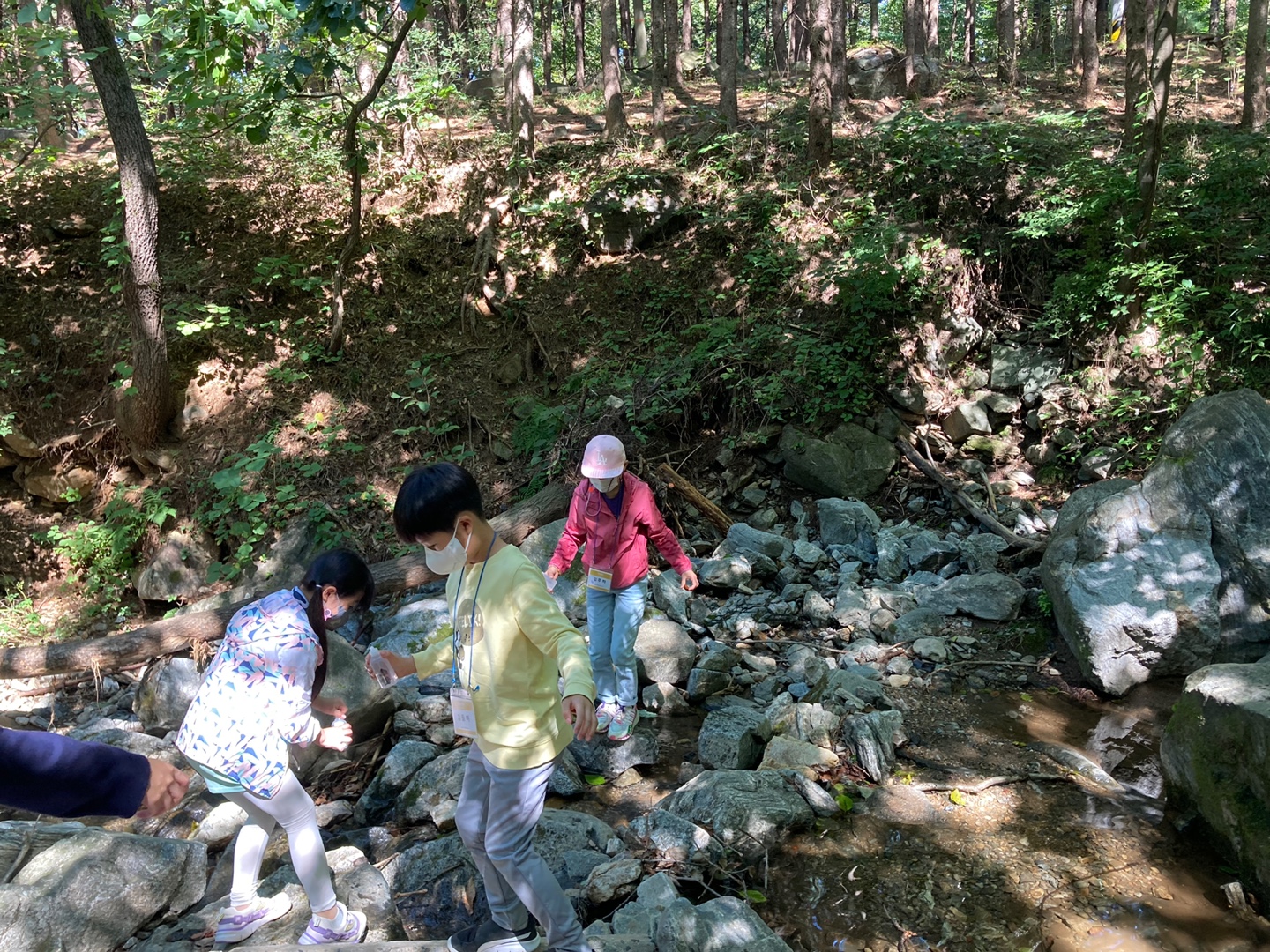 조심조심 계곡에서 물통을 가득 채웠어요!